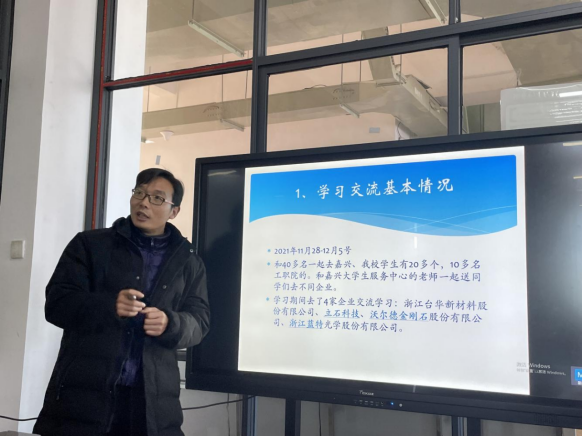 接下来,刘艳伟老师从学习交流基本情况、个人收获和感悟、意见及建议等3个方面进行了分享。他结合自身体会,以幽默风趣的语言,向大家分享了本次学习的感悟。一是长三角、珠三角经济发达地区急需人才;二是公司员工适应能力较强,均得到企业的肯定与赞美;三是公司应在嘉兴建立长期的院企合作制,为员工拓宽就业渠道。