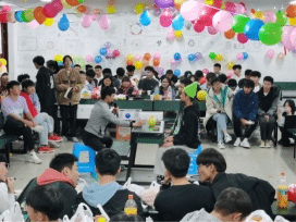 晚会开始前,两个班的同学们一起精心动手布置晚会现场,吹气球、挂彩灯、大家热热闹闹、有说有笑,班委们为大家准备了丰富的零食、水果、饮品并提前摆在了会场。