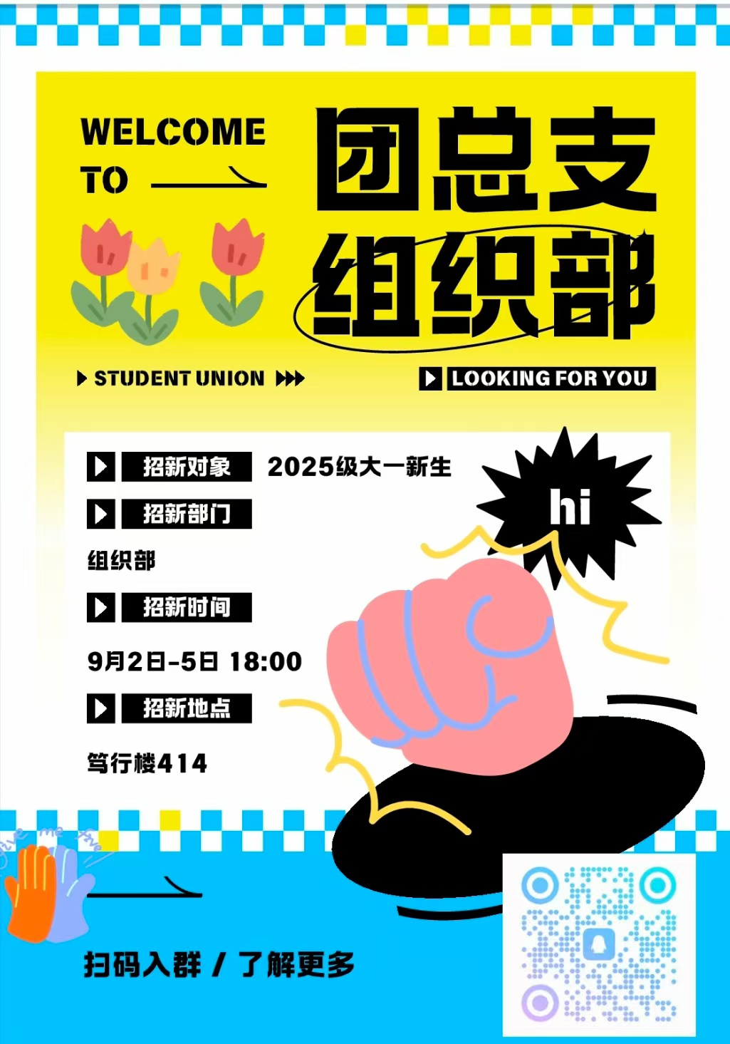 同学们好!团总支组织部是团务工作的核心力量。在这里,你能深度参与团日活动全流程:从精心制作团日活动开展表,为活动规划好方向;到细致收集活动材料,留存每一份珍贵的活动印记;再到认真进行团日活动的总结和批改,助力活动不断完善。每月,你还有机会走进班级,聆听团日活动并给出专业评分,近距离感受班级团建氛围。如果你有热情、有责任心,渴望在团务工作中锻炼自我、服务同学,那就加入我们团总支组织部吧,一起为公司事业贡献力量!