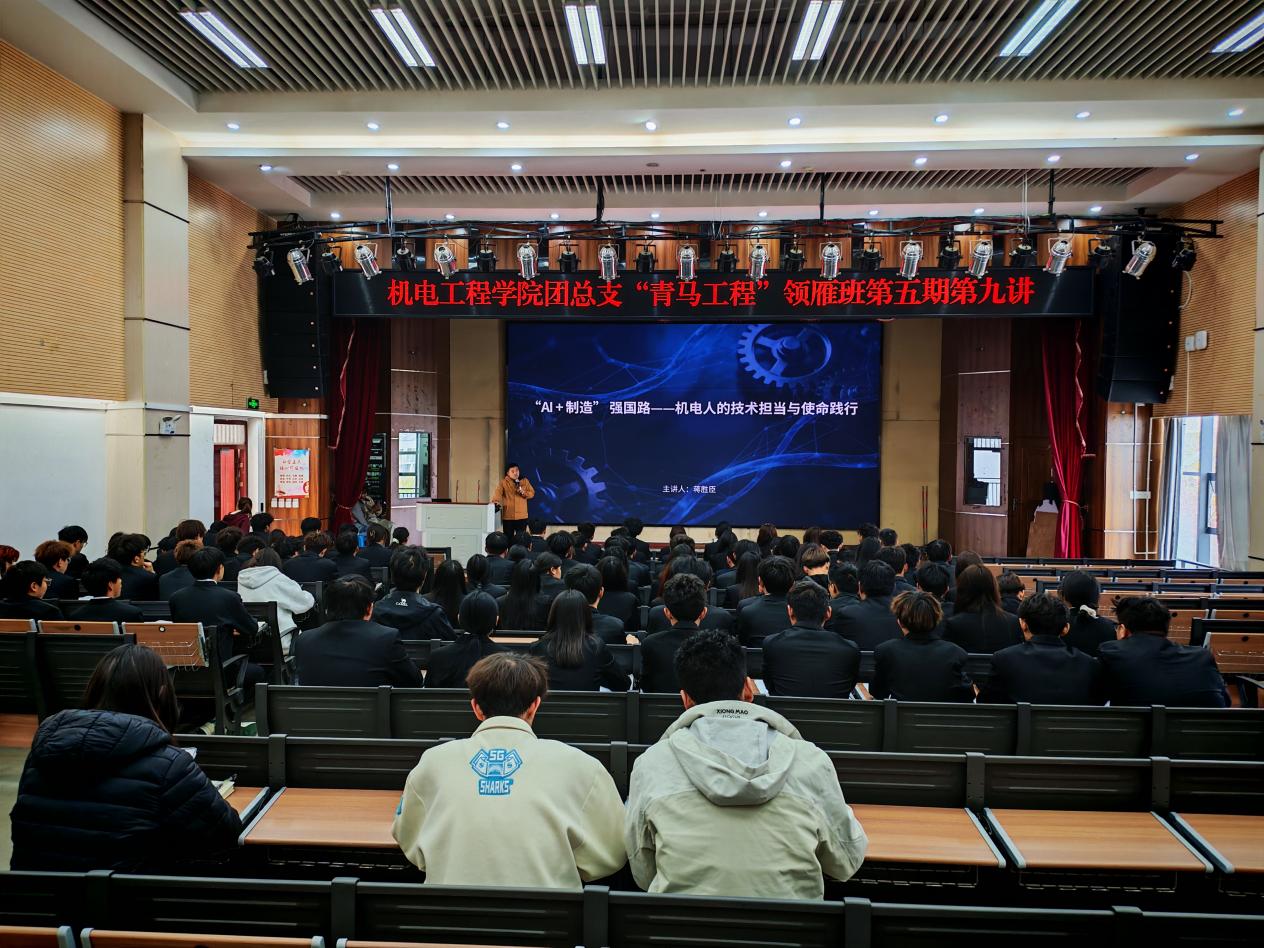 3月4日下午,球盟会青马工程领雁班第五期第九讲在光荣讲堂开讲。公司教师蒋胜臣以“‘AI+制造’强国路——机电人的技术担当与使命践行”为主题,为学员们带来了一场兼具前沿视野与实践意义的专题讲座。团总支副书记普廷云主持本次讲座,领雁班第五期全体学员参训。